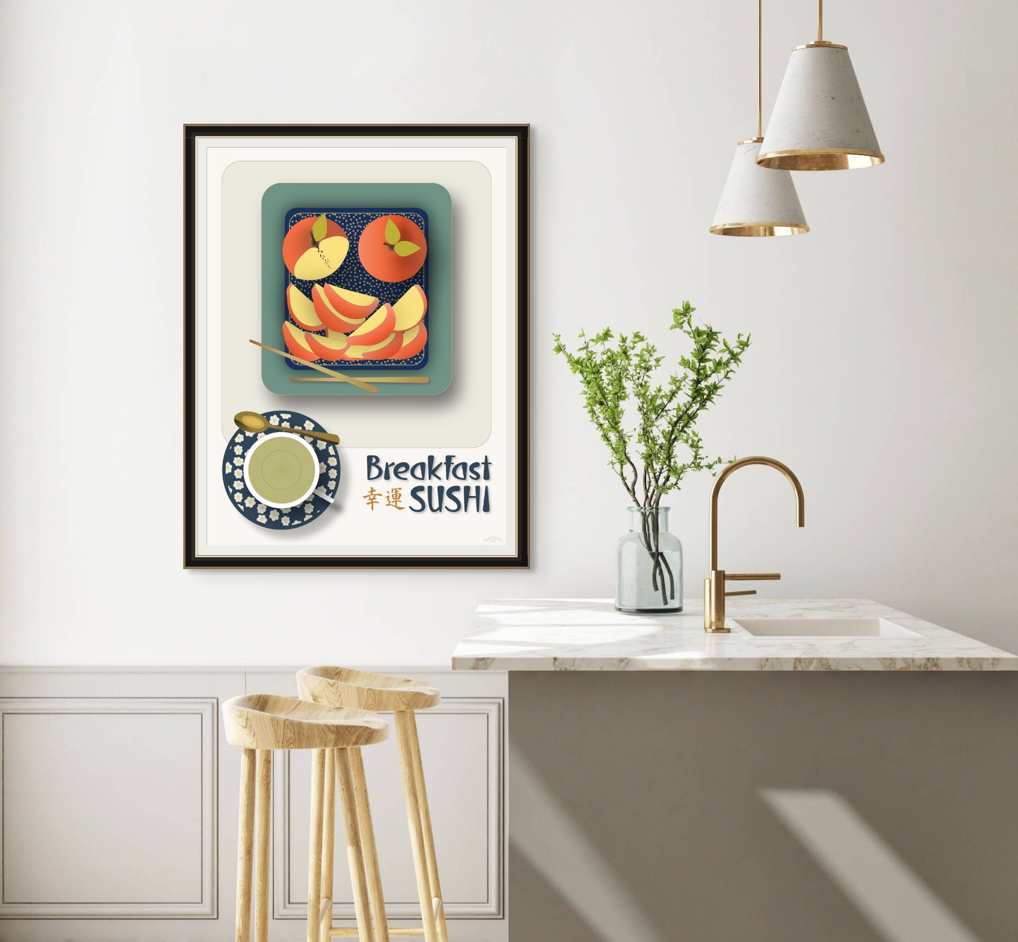 Who says sushi is just for dinner? This fun and vibrant breakfast sushi art print is the perfect way to start your day. The bold colors and intricate details of this print are sure to make it a conversation starter. Printed on high-quality paper, this Art Print would make a great addition to any kitchen, dining room, or office! It's a unique and stylish way to show your love of food while adding a touch of elegance to your space. Hang it up and enjoy your breakfast in style!